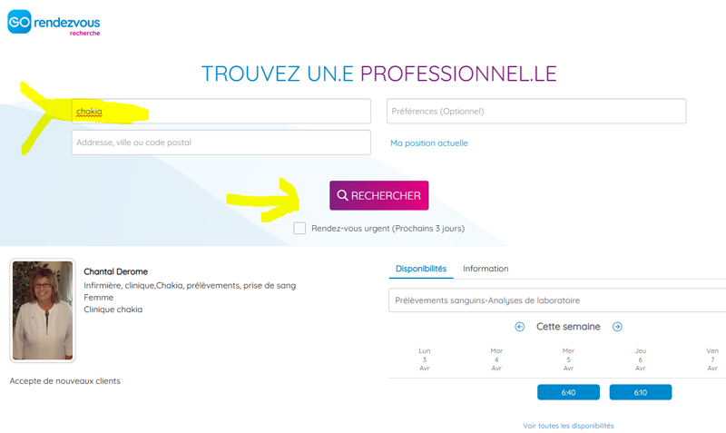 Pour prendre rendez-vous : Cliquer sur Go Rendez-vous et ensuite la première case inscrire CHAKIA et cliquer sur rechercher